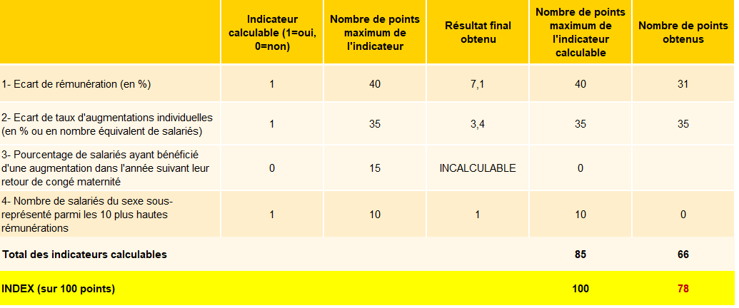 Si nous ne pouvons pas calculer les indicateurs « maternité », « augmentations » ou « promotions », nous neutralisons ces indicateurs. Nous ajustons alors le nombre de points obtenus pour l’Index sur 100, de manière proportionnelle. Les indicateurs calculables doivent représenter au moins 75 points de l’Index ; sinon, nous ne pourrons pas calculer l’Index pour l’année concernée.
