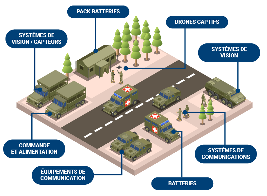 Présents à la fois dans les véhicules et les équipements portés par les militaires, nos câbles sont essentiels au déploiement des systèmes de communication, de commande et d’alimentation. On les retrouve notamment dans les systèmes de vision, les batteries, les équipements de communication embarqués ou encore dans les drones captifs.